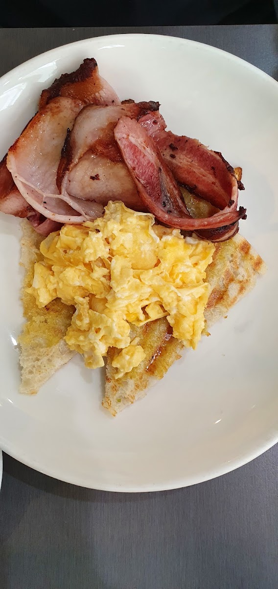 The café draws a steady mix of morning workers, students, and families, making it a natural stop to kick off the day or meet casually during business hours. On any given weekday, you'll find a modest but thoughtfully prepared menu that caters well to classic tastes — with breakfast options like eggs your way or a big breakfast that covers all the hearty bases: grilled tomato, chipolatas, sautéed mushrooms, bacon, and hash browns all on toasted Turkish bread.