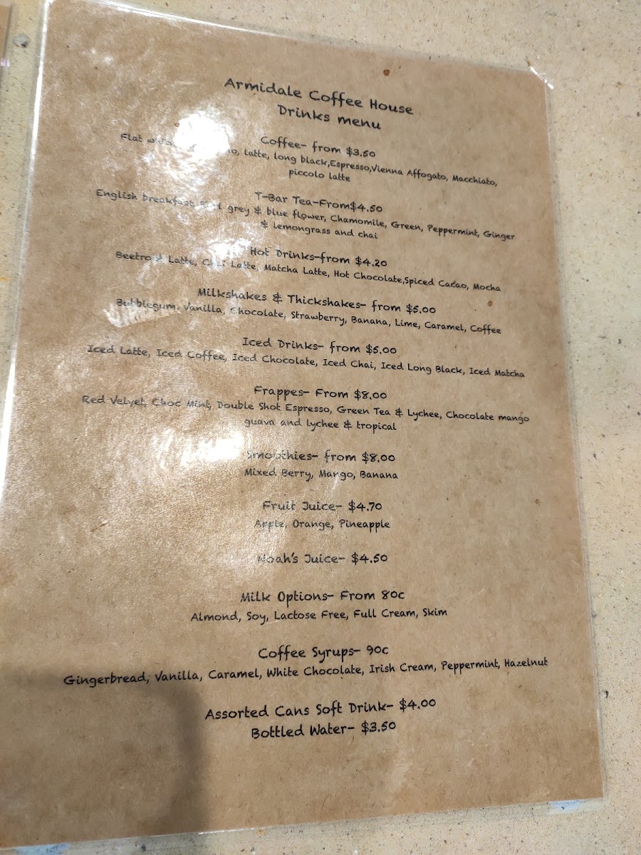 The menu at Armidale Coffee House offers a range of options suited for breakfast, lunch, and casual dining. It is structured to cater to different meal times and preferences, featuring a variety of food items and beverages typically found in a cafe and coffee shop setting.